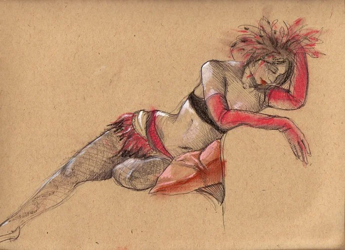 Just thought I would post some sketches from a semi-recent visit to Dr. Sketchy's Anti- Art School open drawing. It's held at Dionysus in downtown Baltimore. I think they usually get some ladies from a local cabaret show to come and pose for people. It's a nice relaxed drawing session where eating and, more importantly, drinking are allowed and encouraged. I had forgotten how much I enjoy figure drawing, especially in a relaxed setting like this. Here are some of my best drawings from the most recent session I went to.