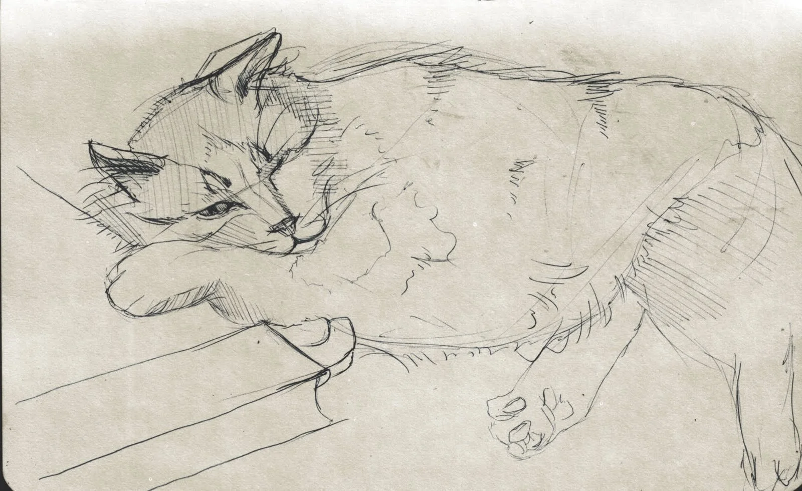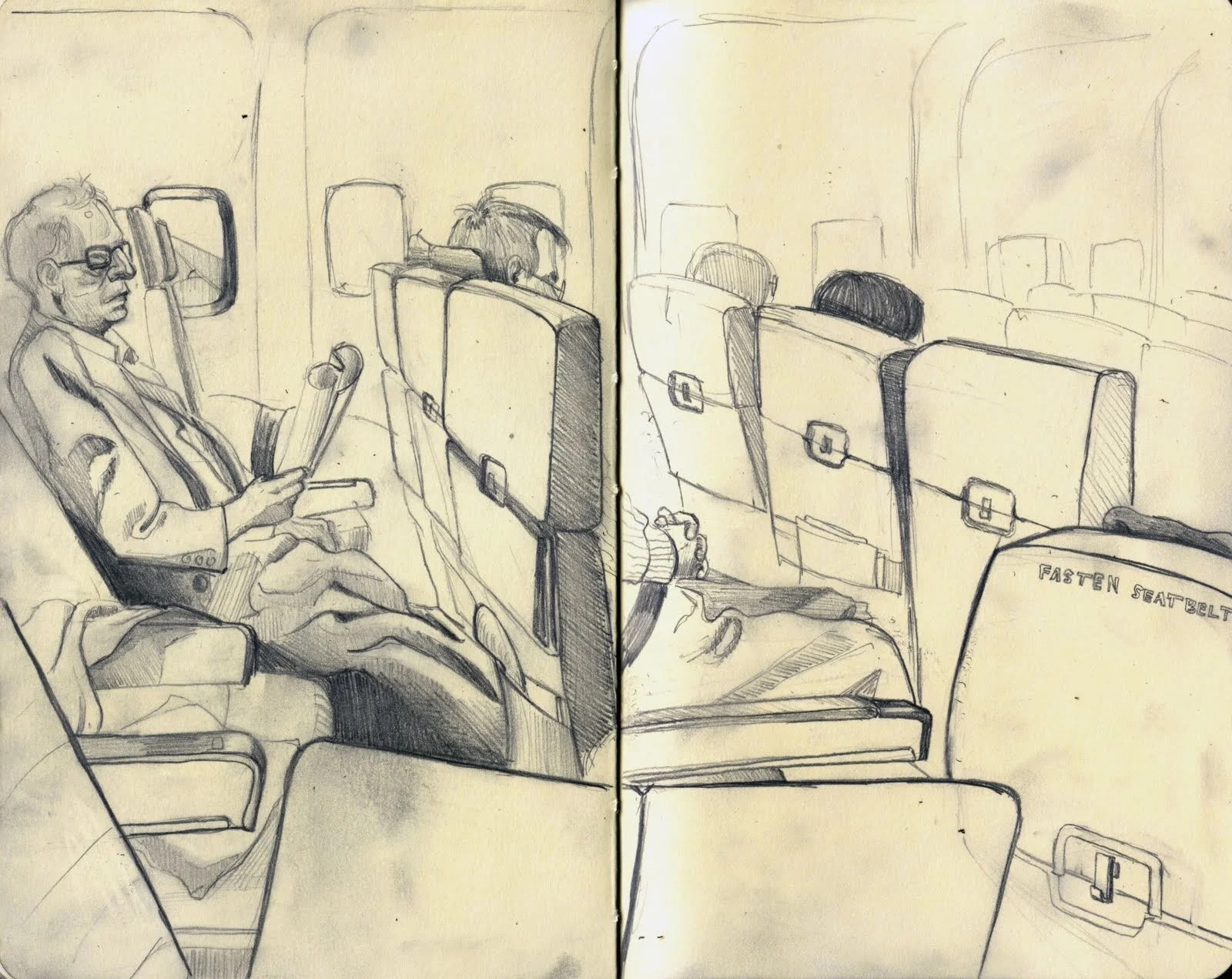 I just got back from a big long trip to England and France to see my family. I had an incredible time and I wish I was still there with them! It's also good to be back though, and I'm going to start a new project soon. I came back feeling refreshed and ready to get to work. Below are some sketches from the plane and a drawing of Bart, my cousin's lovely little kitty, who passed out on the piano just long enough for me to get a few details.